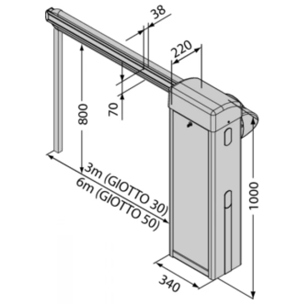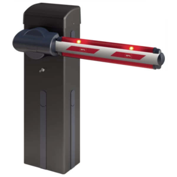 Barrier with 24 V motor power supply for clear opening up to 6 m and opening time 5 s. Impact resistance by means of encoder. Grey RAL 7015.